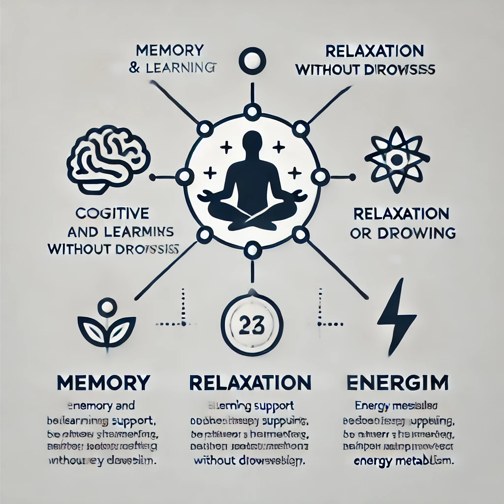 Zawarte składniki pochodzą z ekstraktów roślinnych i grzybowych oraz z aminokwasu naturalnie występującego w zielonej herbacie. Niacyna przyczynia się do utrzymania prawidłowego metabolizmu energetycznego oraz pomaga w prawidłowym funkcjonowaniu układu nerwowego.