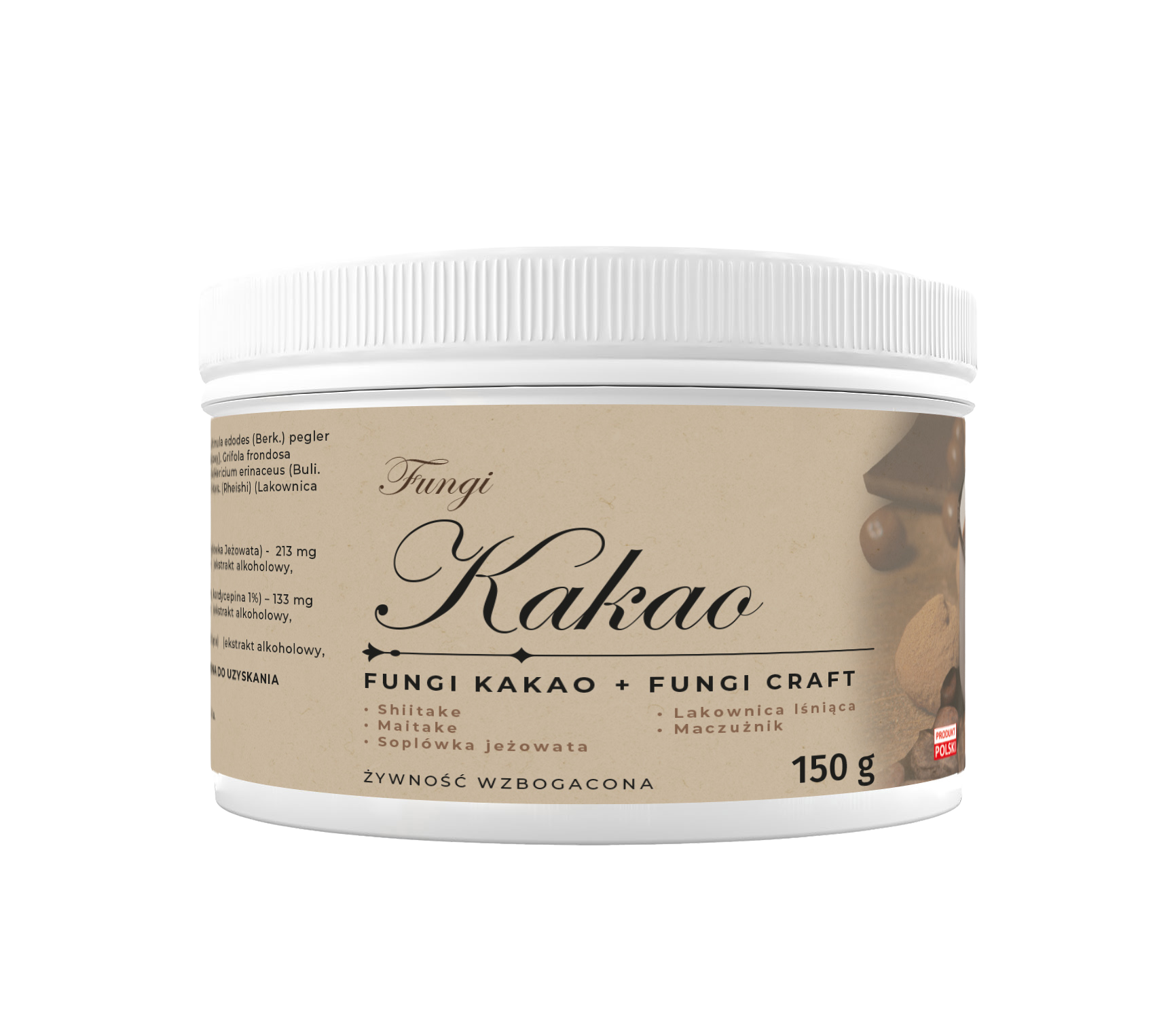 Fungi Kakao to połączenie aromatycznego kakao z funkcjonalnymi ekstraktami grzybowymi. Produkt dostarcza wyjątkowego smaku oraz korzyści zdrowotnych, łącząc przyjemność spożywania kakao z naturalnym wsparciem dla organizmu.
